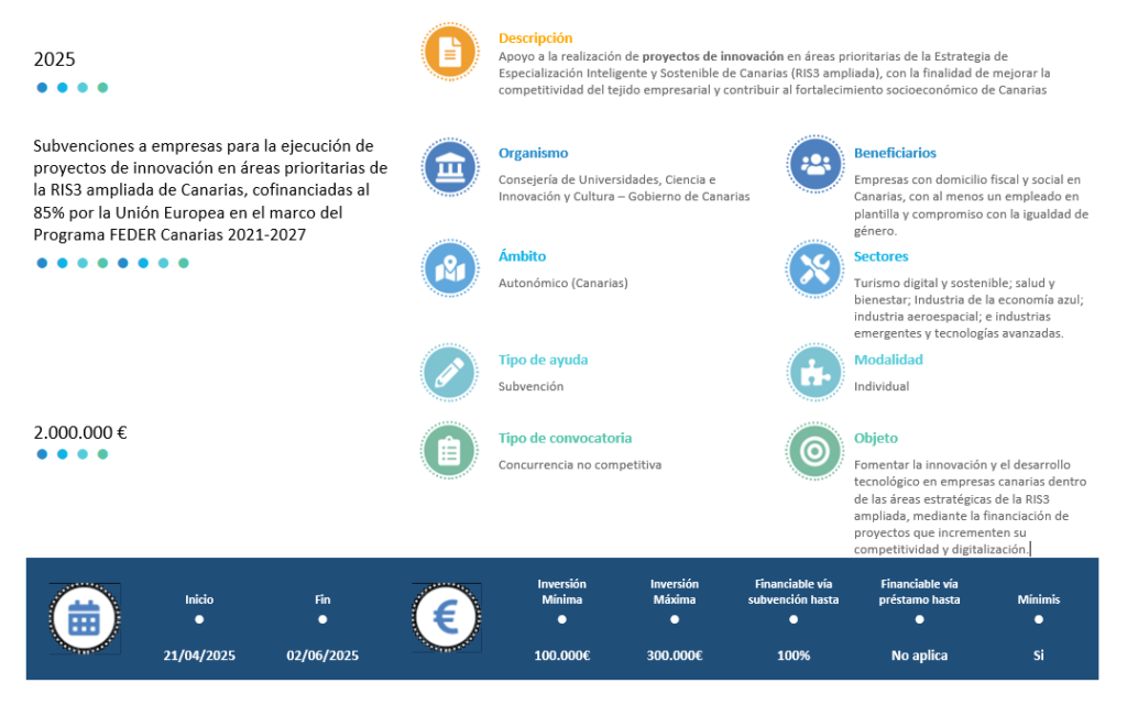 El propósito de estas ayudas es impulsar la competitividad del sector empresarial canario mediante la innovación en productos, procesos y servicios en sectores clave para la región.