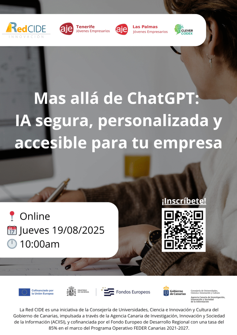 Desde nuestros centros Red CIDE de AJE Las Palmas y AJE Tenerife, te invitamos a participar en una jornada informativa online donde descubriremos las múltiples maneras de integrar la IA en las empresas desde una perspectiva muy sencilla.