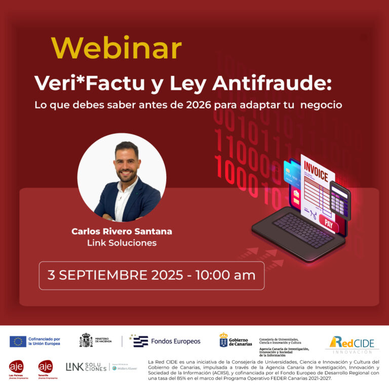 Desde nuestros centros Red CIDE de AJE Las Palmas y AJE Tenerife, te invitamos a participar en un webinar donde descubrir el nuevo sistema Veri*Factu, que entrará en vigor en enero de 2026.
